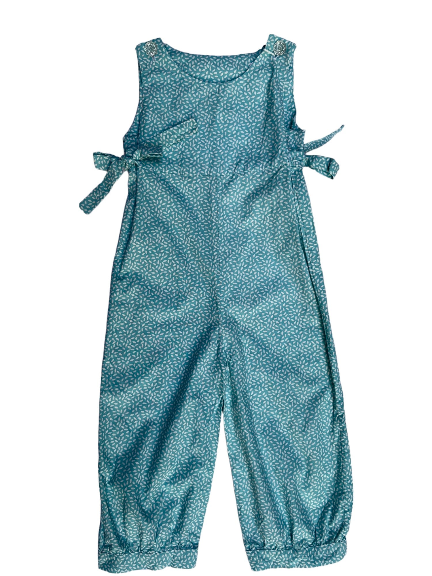 Salopette en coton, couleur vert d'eau. Cousue main. Boutons transparents sur les bretelles. La taille se resserre avec des liens.
