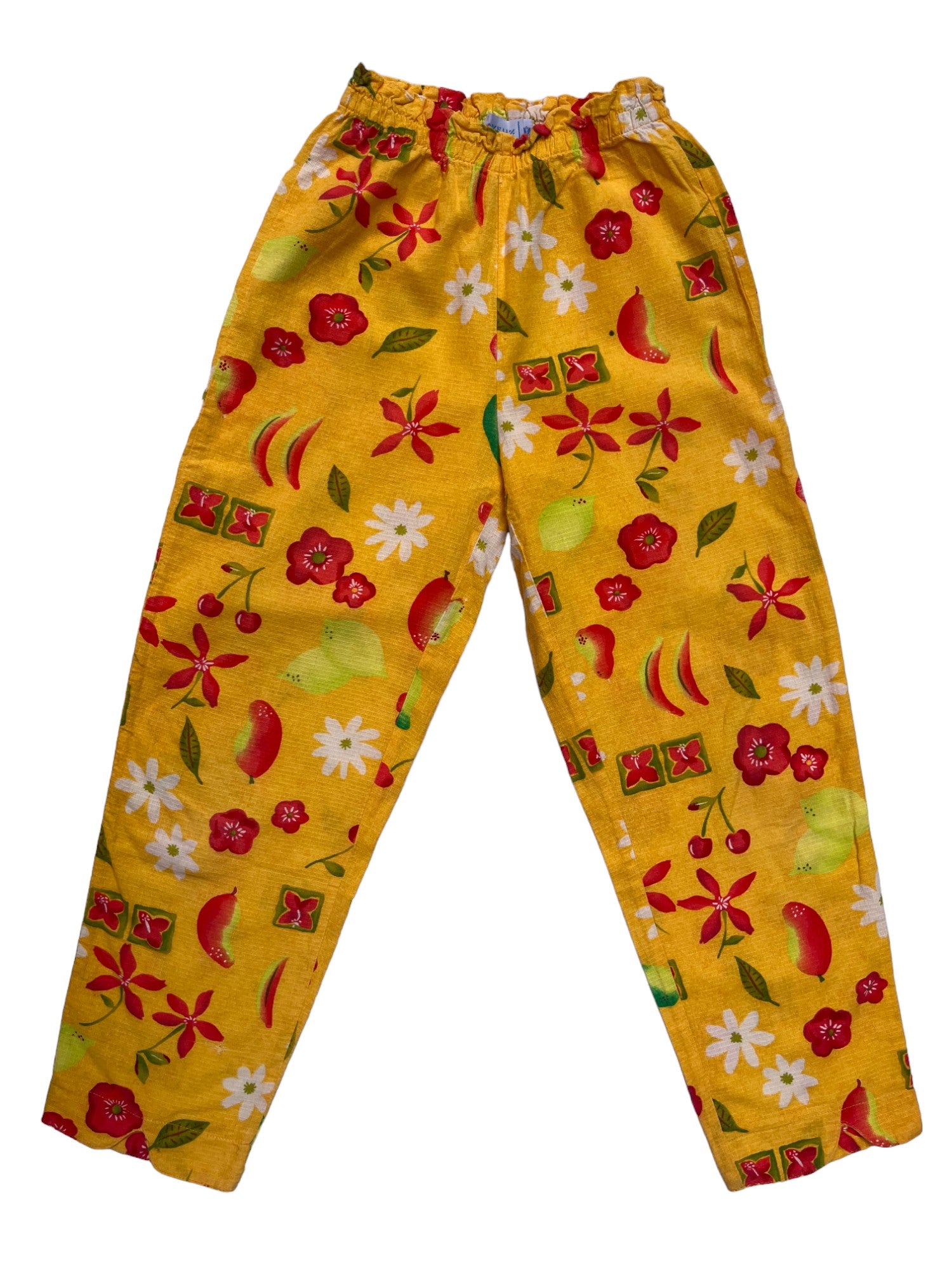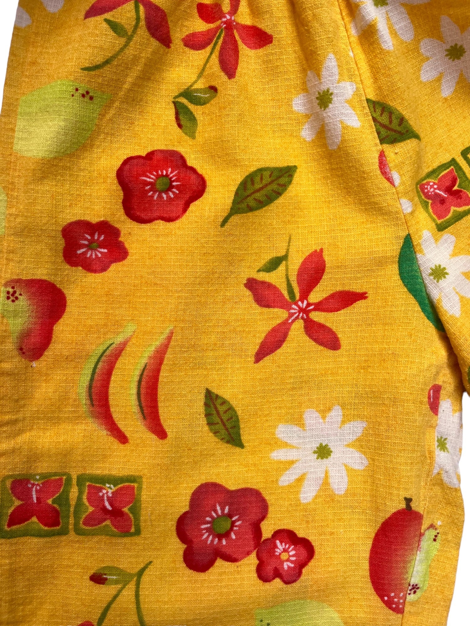 Pantalon jaune en coton avec imprimé fruits et fleurs, trop beau ! Clayeux vintage. Taille 8 ans