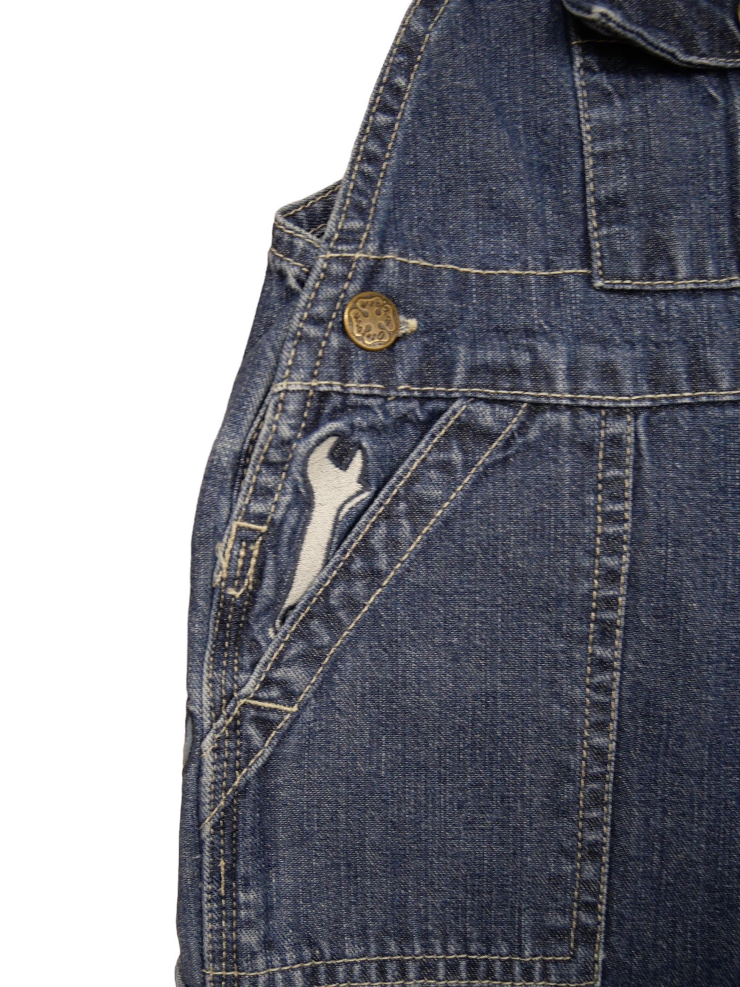 Salopette en jean Oshkosh. Boutons pressions à l'entrejambe. Doublure en Jaccard. Parfait état