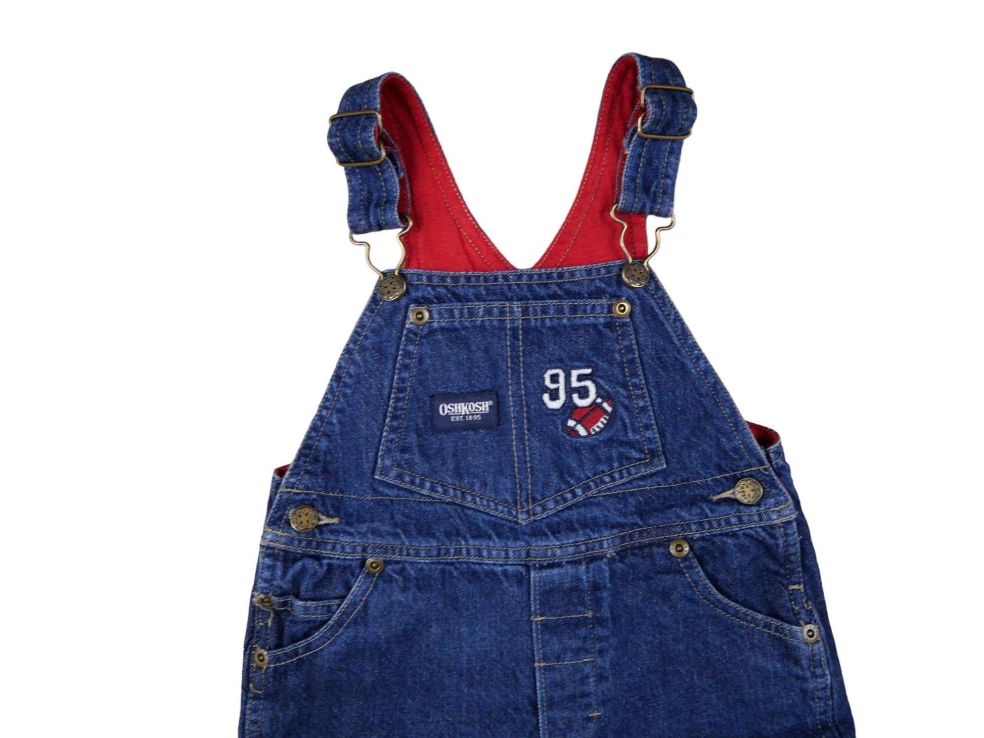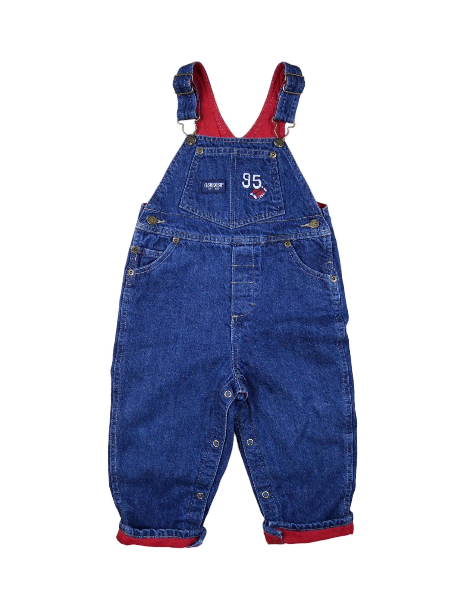 Salopette en jean Oshkosh. Boutons pressions à l'entrejambe. Doublure en coton rouge. Parfait état