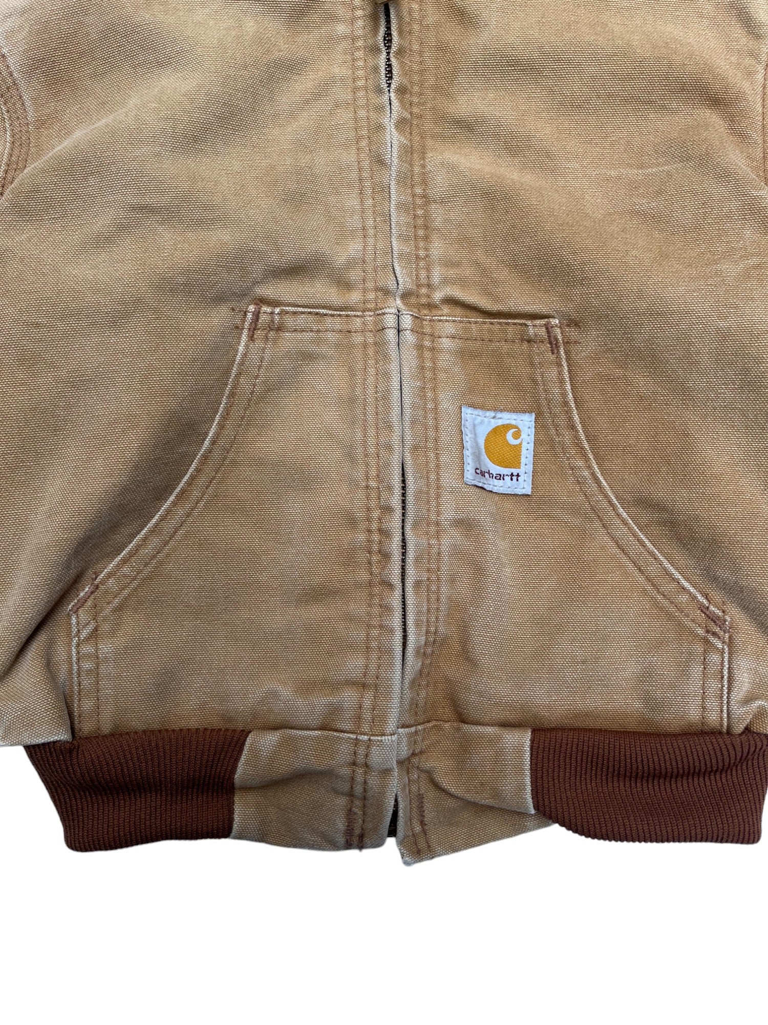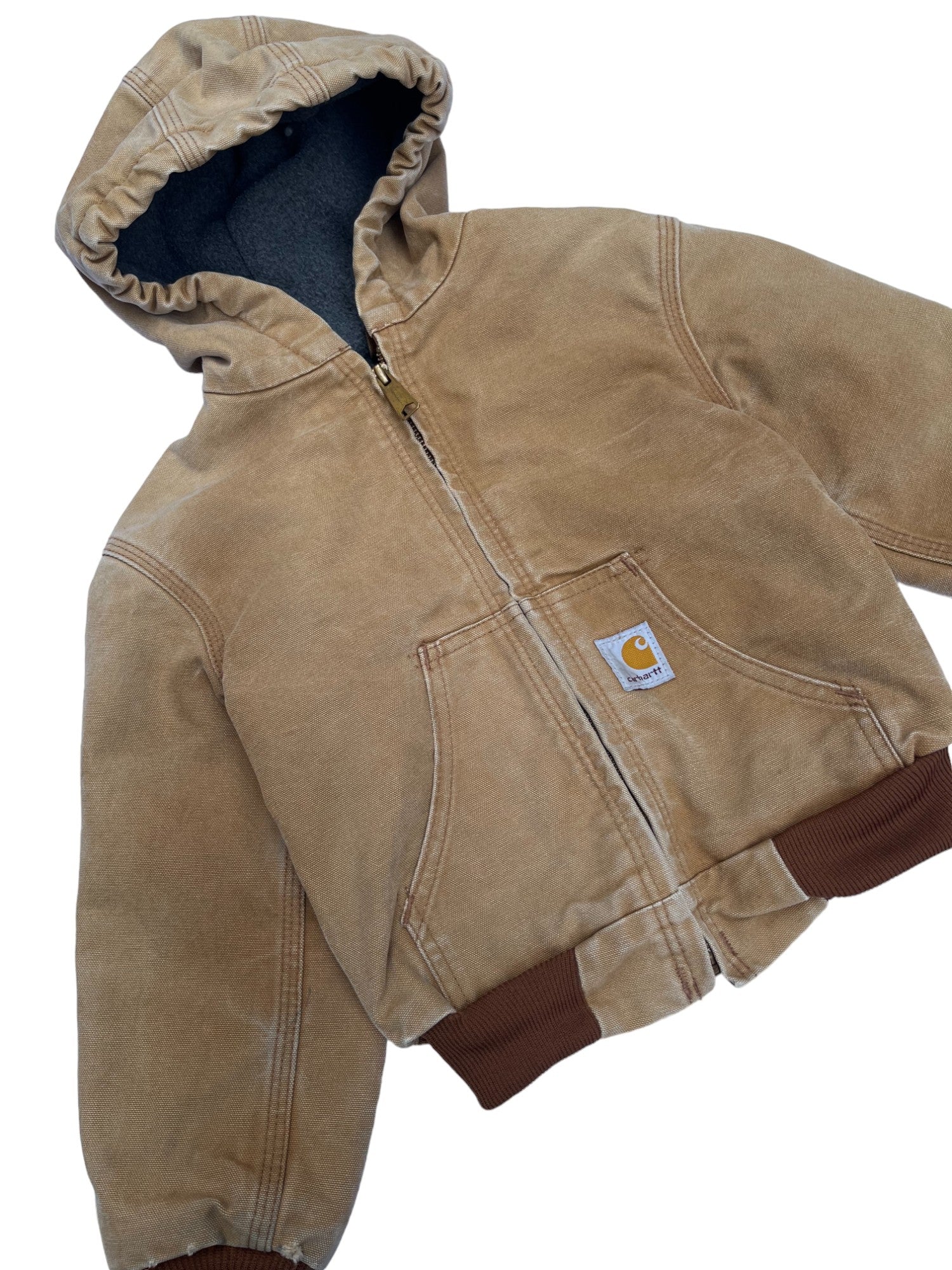 Veste Carhartt vintage 90's, avec capuche, super qualité, toute doublée en polaire. Une poche intérieure. Beau délavage. Bon état : les extrémités des manches sont abîmées, voir les photos. Taille 4/5 ans